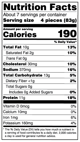 BONELESS SKINLESS CHICKEN BREAST WITH RIB MEAT, WATER, WHEAT FLOUR, YELLOW CORN FLOUR, ISOLATED SOY PROTEIN. CONTAINS 2% OR LESS OF THE FOLLOWING: FLAXSEED MEAL, SEA SALT, NATURAL FLAVOR, NATURAL* CHICKEN FLAVOR, YEAST, EXTRACTIVE OF PAPRIKA (COLOR), CANOLA OIL, DISTILLED VINEGAR, CORN STARCH, GUAR GUM, WHEAT GLUTEN, LEAVENING (SODIUM BICARBONATE), SALT. ALLERGENS : SOY, WHEAT.